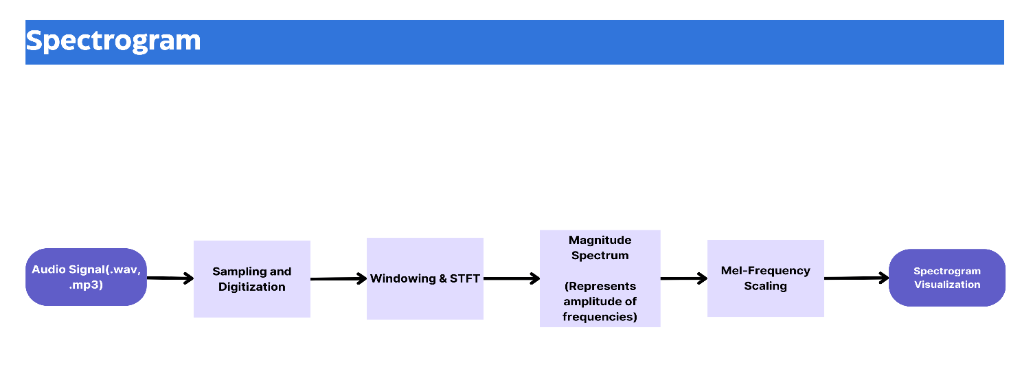 - Spectrogram: Another approach is to create a spectrogram, a visual representation of the audio signal over time. A spectrogram converts the audio into a 2D image, where the x-axis represents time, the y-axis represents frequency, and the color intensity represents amplitude. This image can then be fed into a model as if it were an image in an image recognition task.
