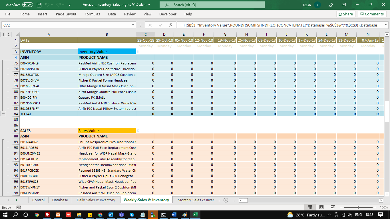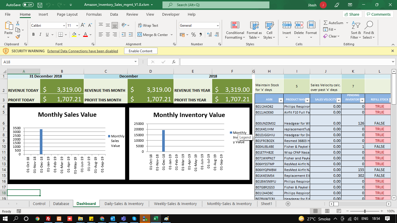 Helped a US based Amazon seller with inventory related reporting (with Dashboards, graphs, daily/weekly/monthly sales data and performance). Excel files extracted from Amazon system was utilized as input to generate required reports